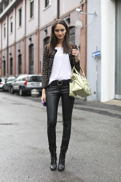 Mi preferida de hoy, la escogí porque me recordó a una conversación que tuve con Yael ayer, sobre los pantalones en cuero negro. A las dos nos gustaría tener unos, ella ya tiene unos en vista de zara y yo los prefiero len shorts para salir. A parte de la ya conocida forma de llevarlos con camisetas o jerséis largos de punto, esta también es una manera muy chula de ponerlos como look de día.