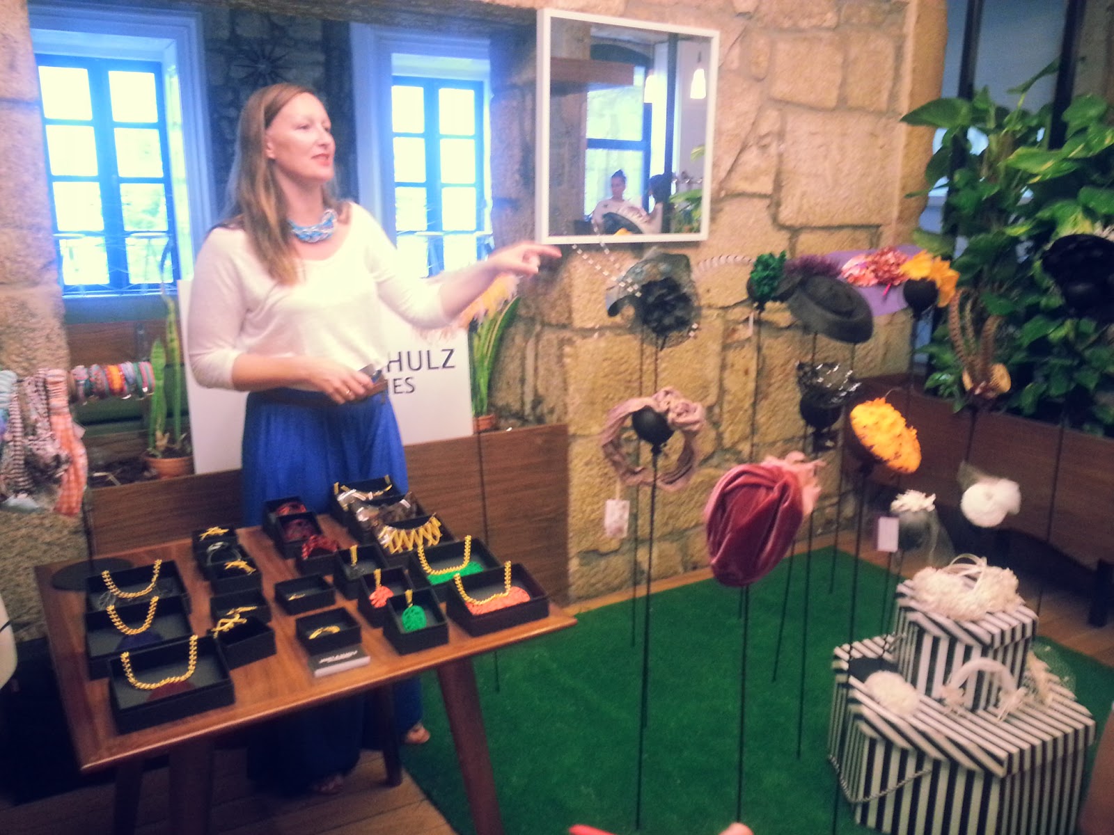 Janet Schulz conocida por ser la creadora de la famosa pulsera de la Eurocopa. Nos mostró sus diseños; collares, pulseras y una maravillosa colección de tocados. Todos los tocados con los que salimos en las fotos son suyos.